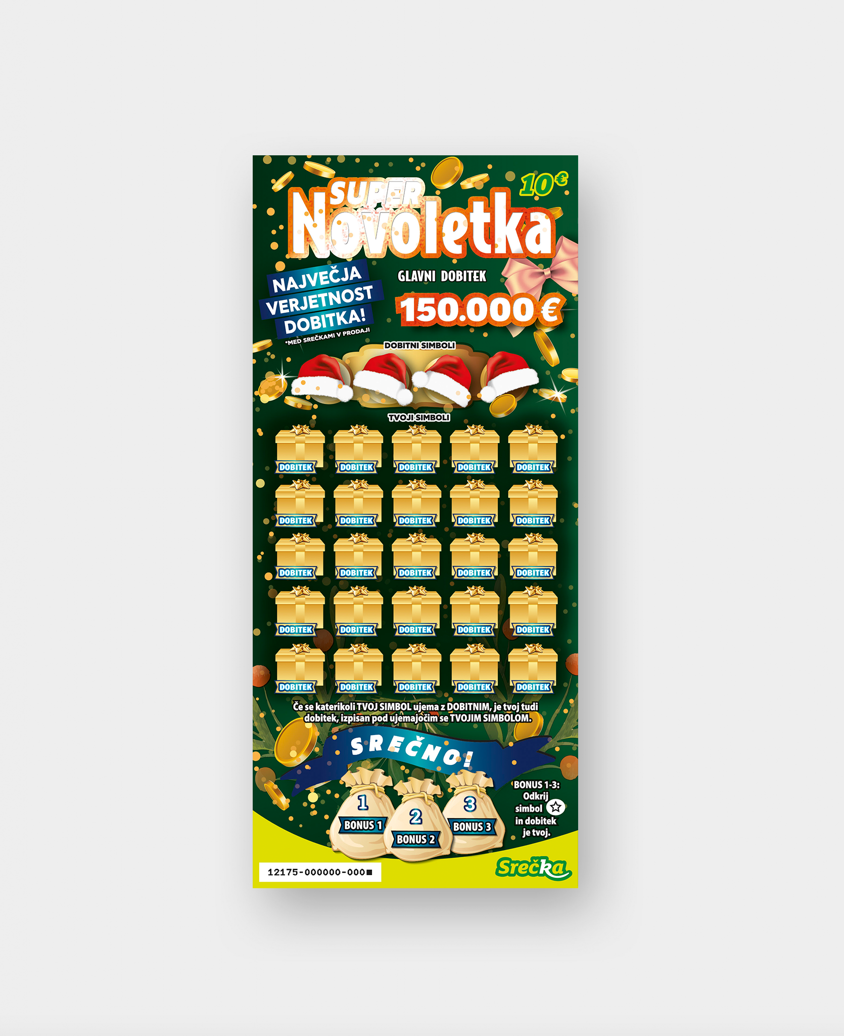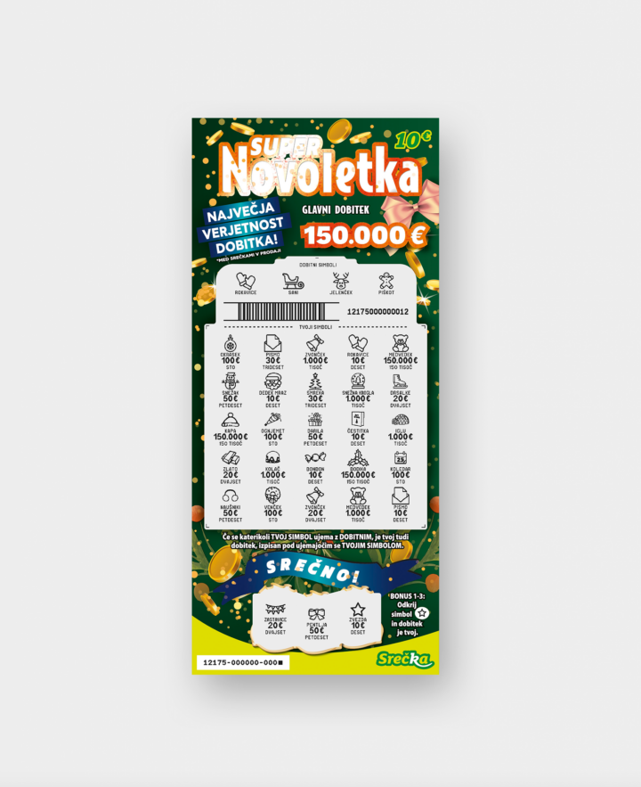Spet je tukaj Super Novoletka! Srečka z največjo verjetnostjo dobitka med vsemi srečkami in glavnim dobitkom 150.000€!